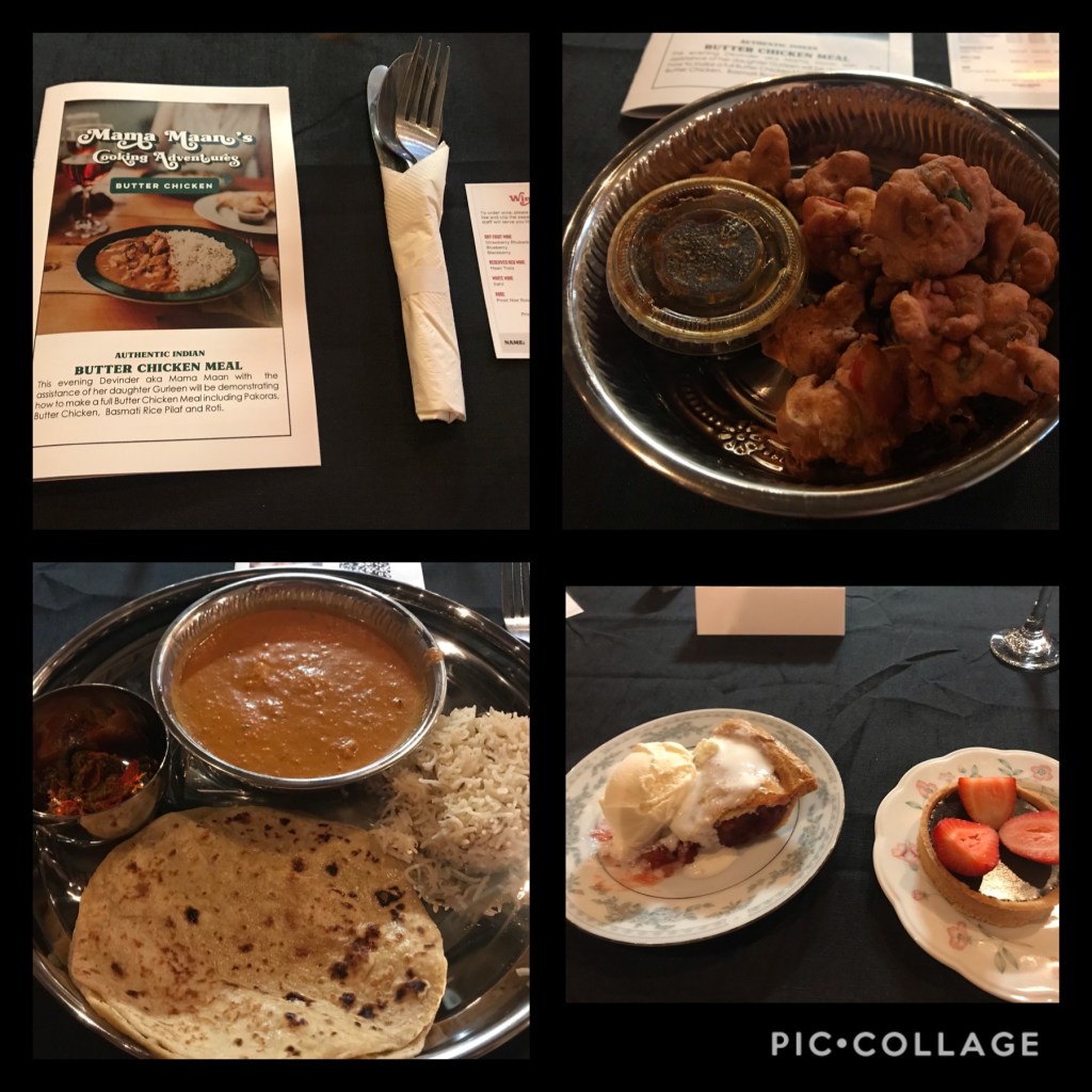 For appetizers, it was the veggie Pakoras, which tasted very fresh. Each person was given a portion of their own. For the main meal itself, as titled by the evening, was Butter Chicken, served with a side of Rice Pilaf and a side serving of Roti. The aromas that filled the air were magnificent and mouth watering. To my surprise, as I think was to a few, I never would have thought about adding spices and oil to my pot as well as an onion before putting in the rice and allowing it to cook together – the results are very tasty indeed. For dessert, we has a chocolate tart with fresh strawberries and pie with ice cream – maybe the next cooking class we take can be to learn how to make these. Each person was given two drink tickets for the evening which we enjoyed through the meal, himself their strawberry lemonade and I had a glass of each of their wines, which I’m thinking the blueberry one is now my favourite.